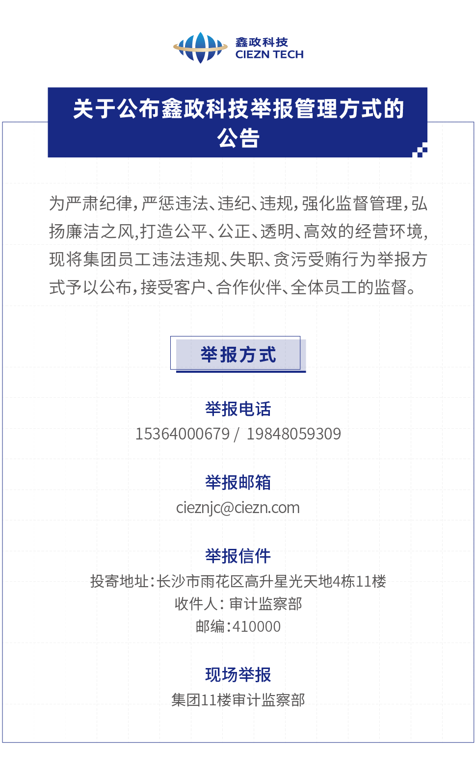關(guān)于公布鑫政科技舉報(bào)管理方式的公告