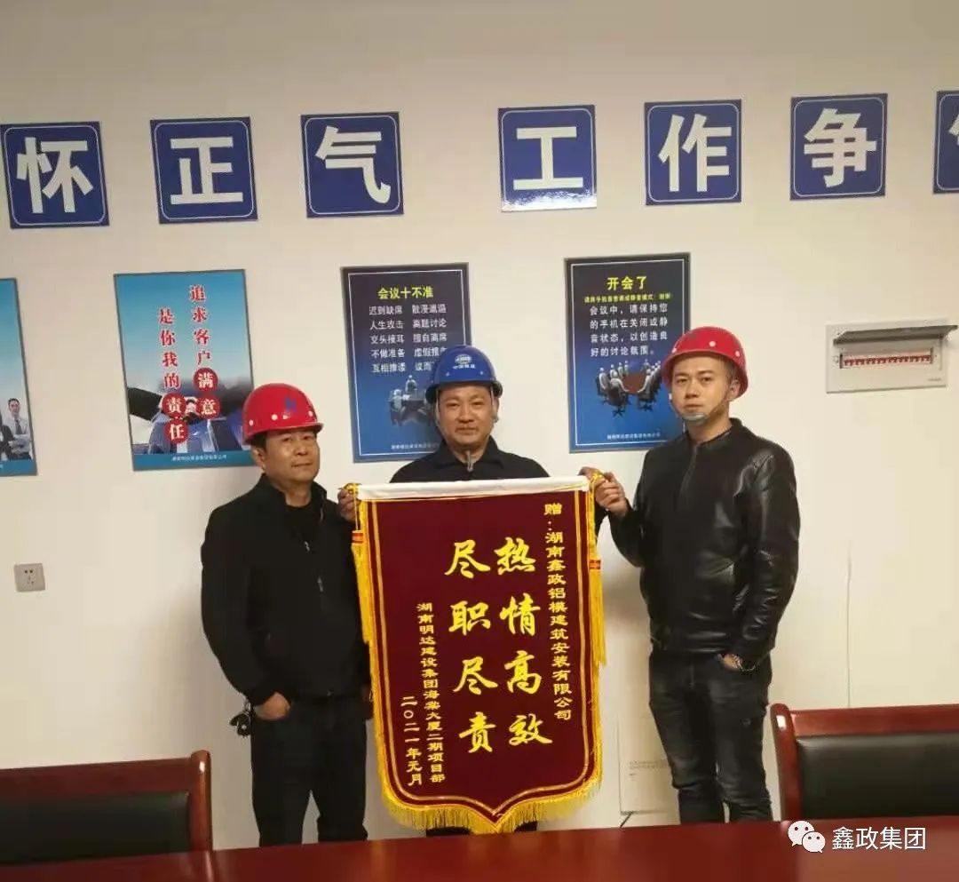 瀏覽次數:1182新年新氣象,鑫政開門紅。近日,湖南明達建設集團有限公司益陽海棠大廈項目部送來錦旗和感謝信,對鑫政安裝工程服務部申立軍同志在項目上熱情高效的工作表現,給予了充分肯定和高度評價。